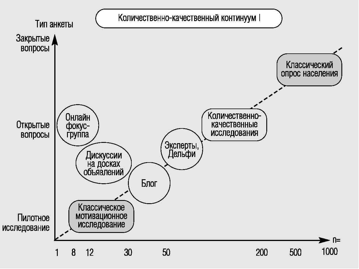Другое важное различие – в структуре собираемой информации. Если анкеты количественных исследований состоят по большей части из так называемых закрытых вопросов, то основным свойством качественных исследований является наличие открытых вопросов, глубинных интервью, дискуссий, а также разнообразных психологических тестов. Поскольку многие из этих подходов могут использоваться также в режиме онлайн, приведем краткий перечень качественных методик маркетинговых исследований.