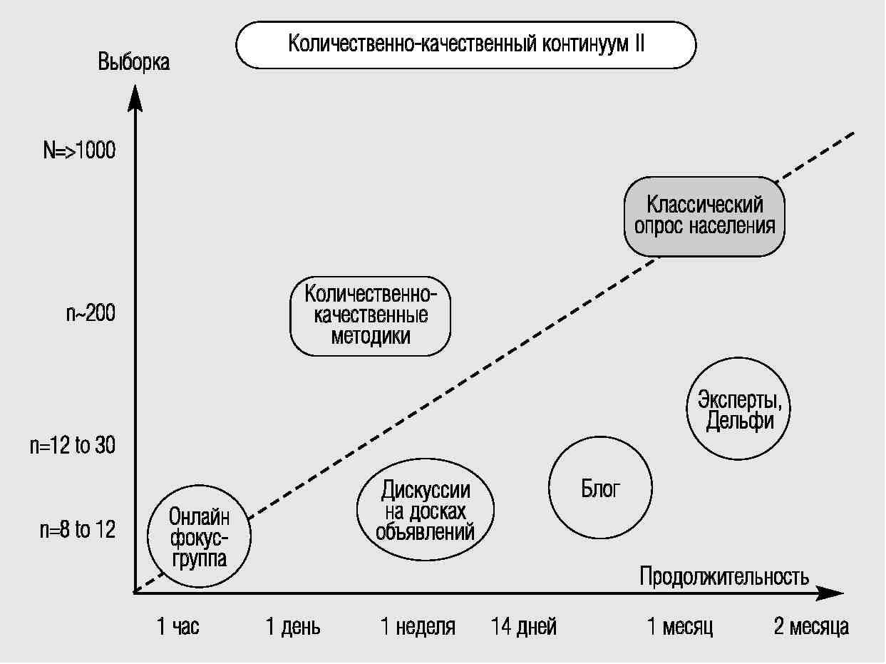 Одновременно с количественными не могли не развиваться и качественные онлайн-исследования. Однако для их корректного использования необходимо уметь проводить четкие границы области допустимости с точки зрения получения валидных данных и экономической целесообразности.